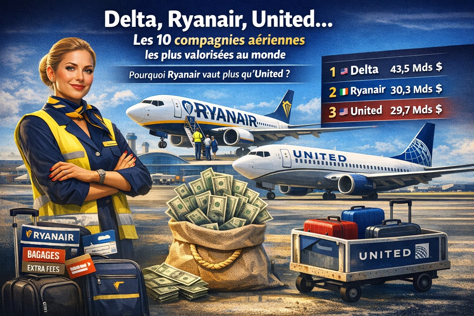 Le dernier classement par capitalisation boursière réserve une surprise : Ryanair, la spécialiste des vols low-cost, devance United Airlines, pourtant bien plus imposante en nombre de passagers et en routes long-courriers. Comment expliquer qu’une compagnie « pas chère » vaille davantage qu’un géant traditionnel ?